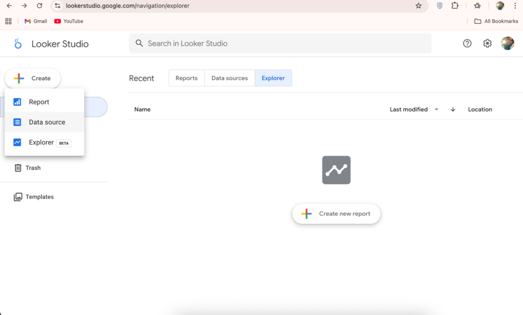 حالا وقتشه وارد خود ابزار بشی. برای شروع، باید یک منبع داده اضافه کنی. از منوی Create در بالا سمت چپ، گزینه Data Source رو انتخاب میکنی. این کار باعث میشه منبع دادهای که وصل میکنی، بعدا برای گزارشهای دیگه هم در دسترس باشه.