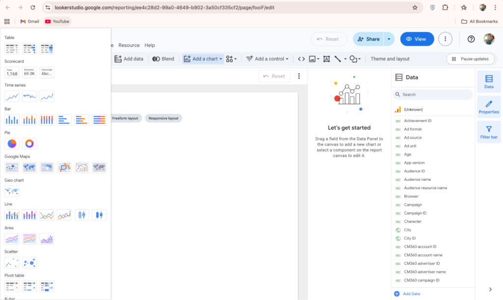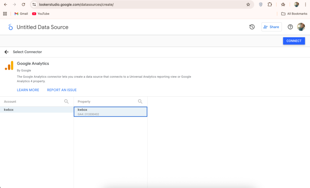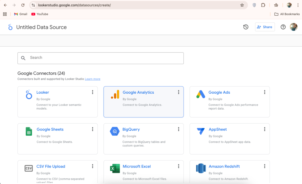 در این مرحله، منبع دادهات رو انتخاب میکنی. لوکر استودیو بهصورت پیشفرض تعدادی کانکتور داره، اما با کانکتورهای پارتنر میتونی به طیف خیلی وسیعی از منابع داده دسترسی داشته باشی. اینجاست که واید بودن Looker Studio خودش رو نشون میده.