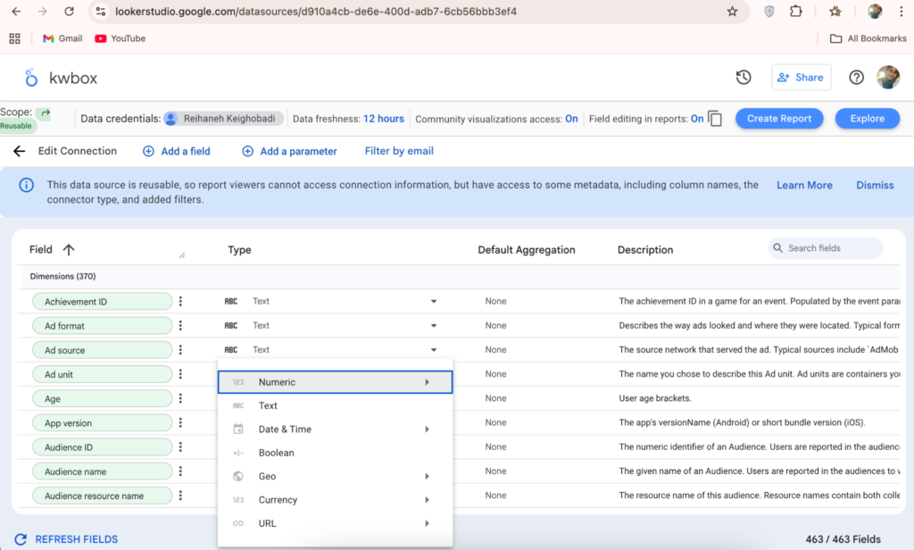 اینجا یکی از مهمترین بخشهاست که خیلیها بیدقت ردش میکنن. بعد از اتصال منبع داده، باید نوع فیلدها و نحوه تجمیعشون رو بررسی کنی.